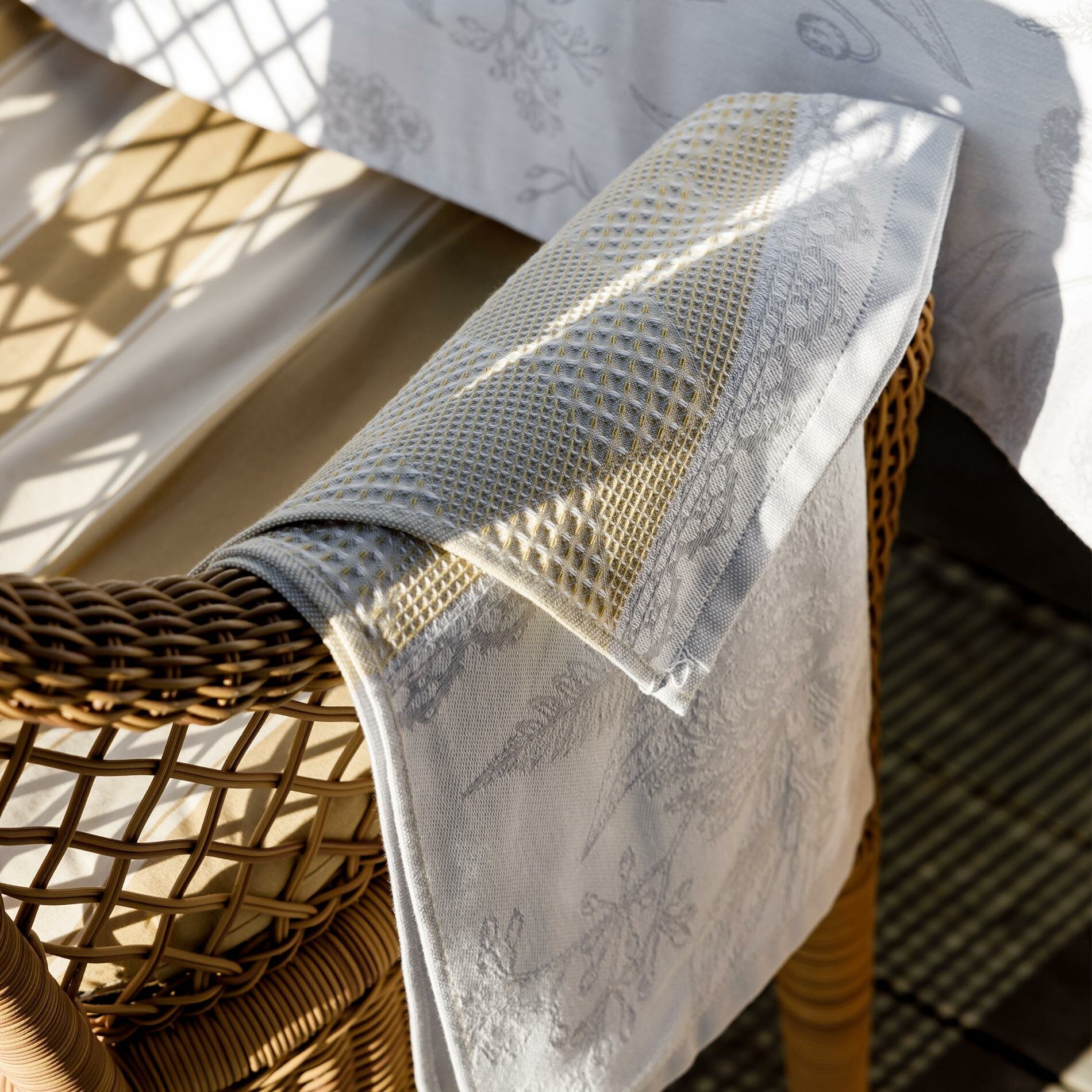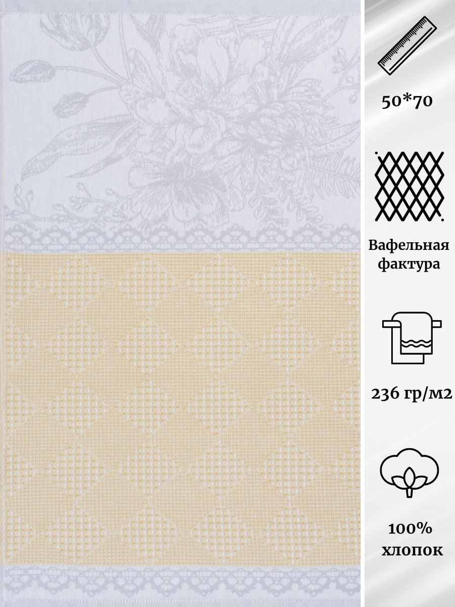 Вафельная фактура ткани обеспечивает быстрое и эффективное впитывание влаги, а также позволяет полотенцу быстро сохнуть. Плотность ткани составляет 236 г/м², что гарантирует прочность и долговечность изделия.
