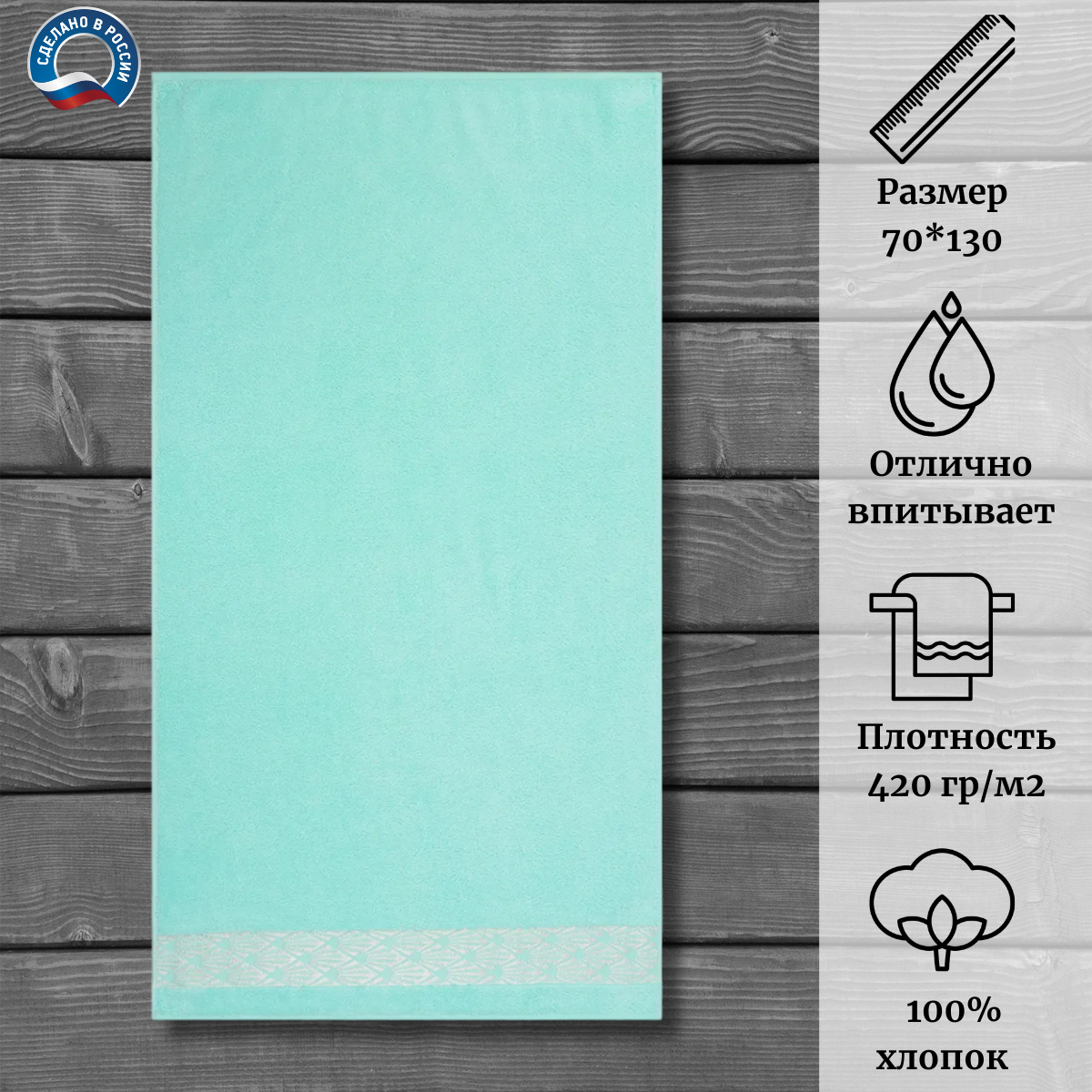 Полотенце произведено в России, что гарантирует высокое качество изделия. Плотность ткани составляет 420 г/м², что обеспечивает прочность и долговечность полотенца.