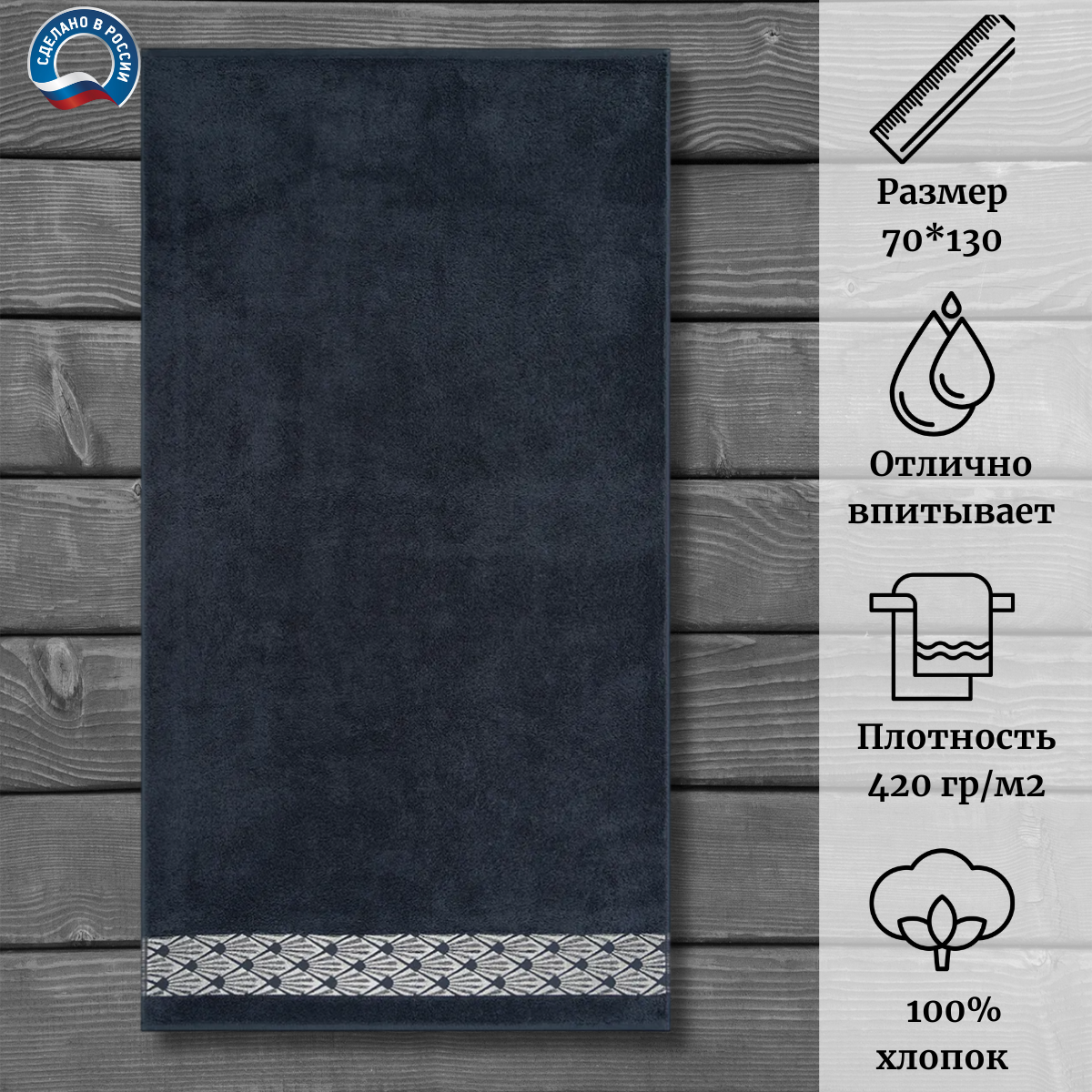 Полотенце произведено в России, что гарантирует высокое качество изделия. Плотность ткани составляет 420 г/м², что обеспечивает прочность и долговечность полотенца.