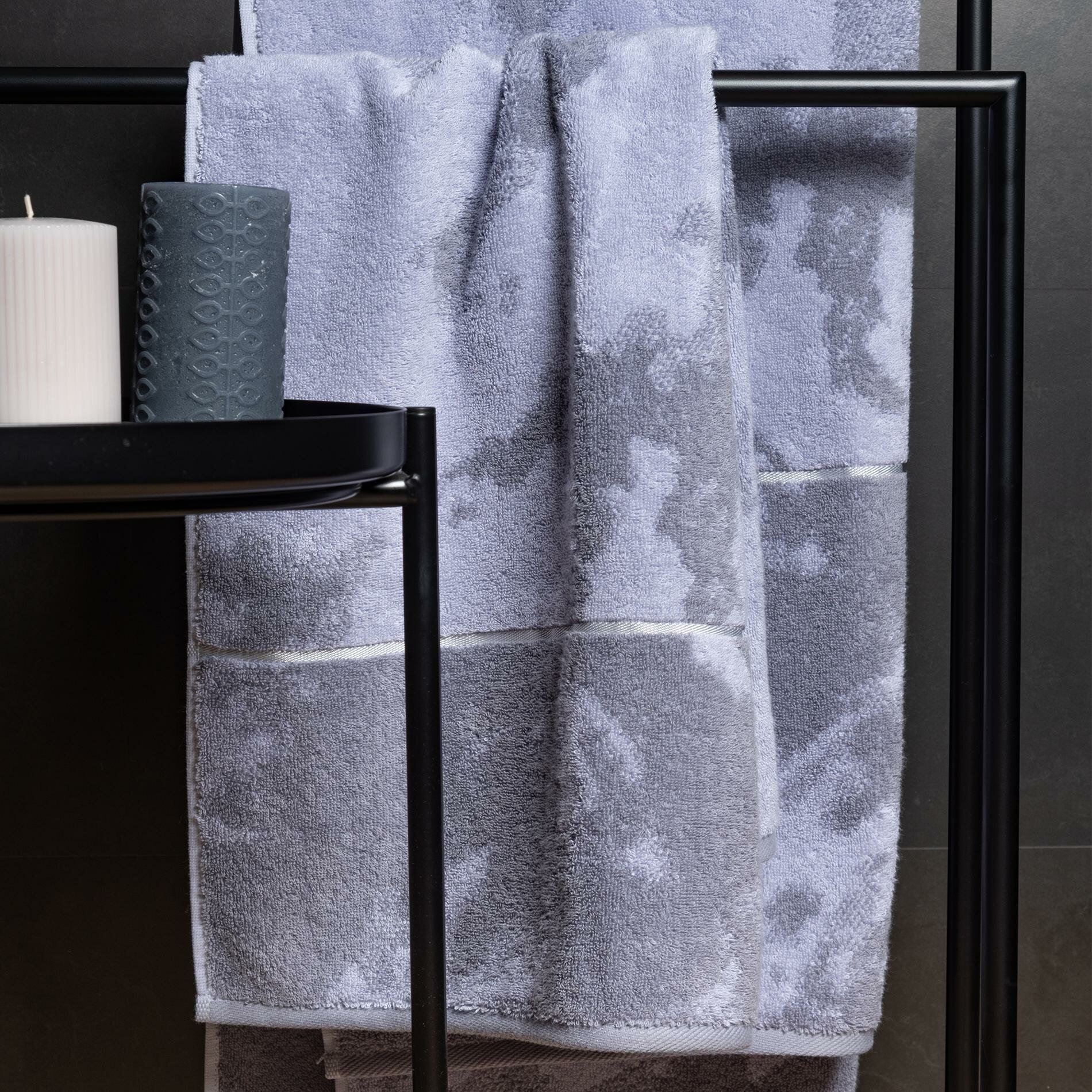 Дизайн полотенца выполнен в абстрактном стиле, что придает ему оригинальность и стиль. Цвет полотенца – серый, что делает его нейтральным и подходящим для любого интерьера ванной комнаты.
