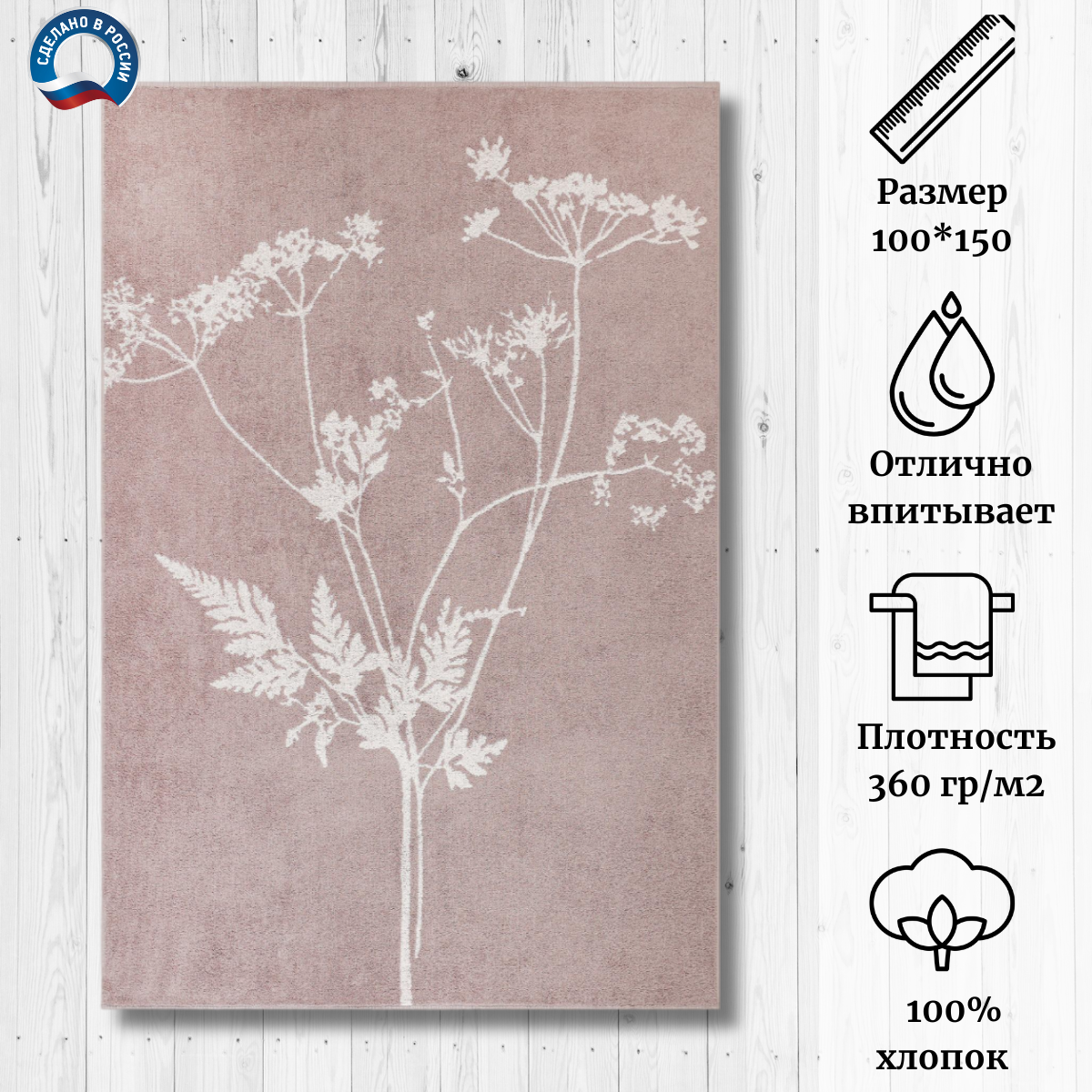 Полотенце выполнено из 100% хлопка, что делает его мягким и приятным на ощупь. Плотность ткани составляет 360 г/м2, что обеспечивает высокую впитываемость и долговечность изделия.